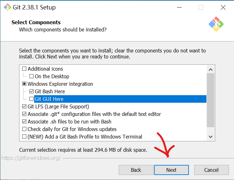 根据自己的需要,可以取消勾选Git Gui Here右键菜单选项,然后点击Next