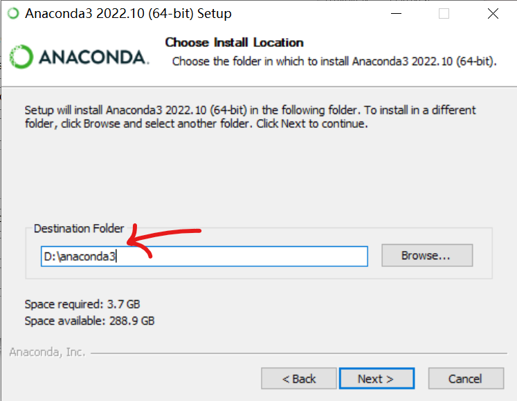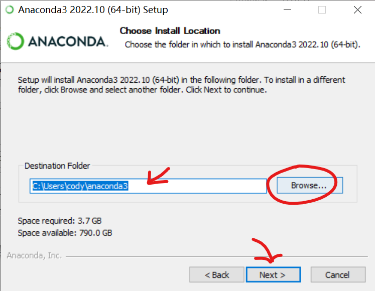 然后这边选择安装位置,如果这边显示的目录里有中文,请参考中文用户名conda安装配置方法
