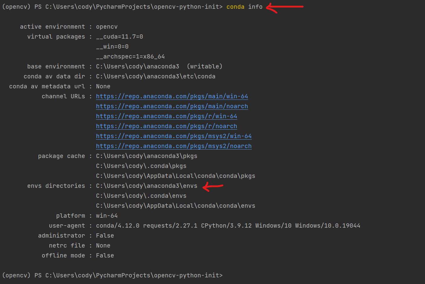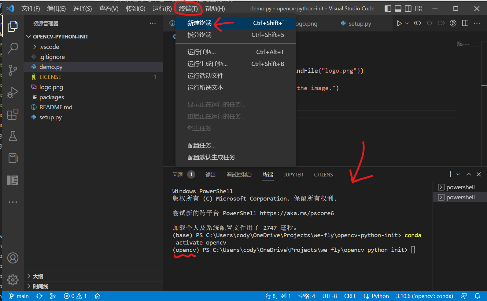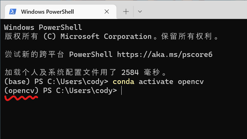 conda activate opencv这个时候你的终端最左侧应该会从(base)变成(opencv)或者<conda环境名称>