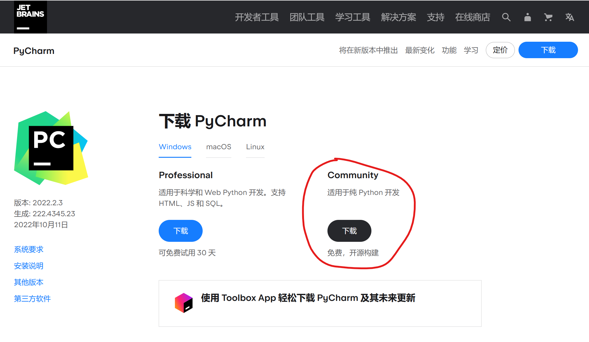 首先下载 Pycharm 这边我们下载Community社区版。别问专业版怎么搞,我们不提供盗版,请自行购买正版。目前学习阶段是用不到专业版功能的,等你真正有需求的时候,你已经上班了,你的老板会给你买的。