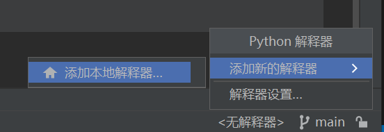 打开后,页面右下角应该是显示<无解释器>,点一下,选择添加新的解释器 - 添加本地解释器...