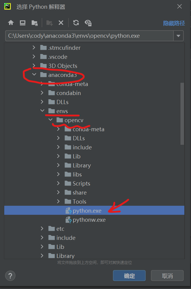 在弹出的界面里,找到你的环境位置,然后选择环境名称目录下的python.exe
