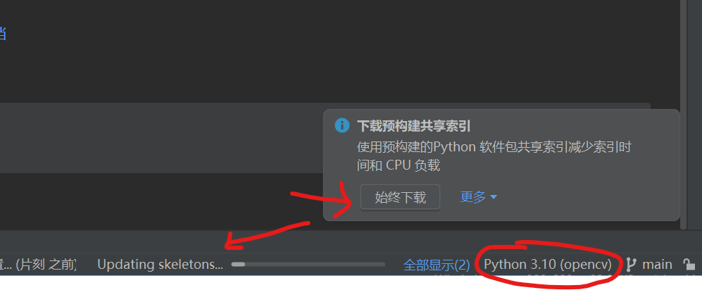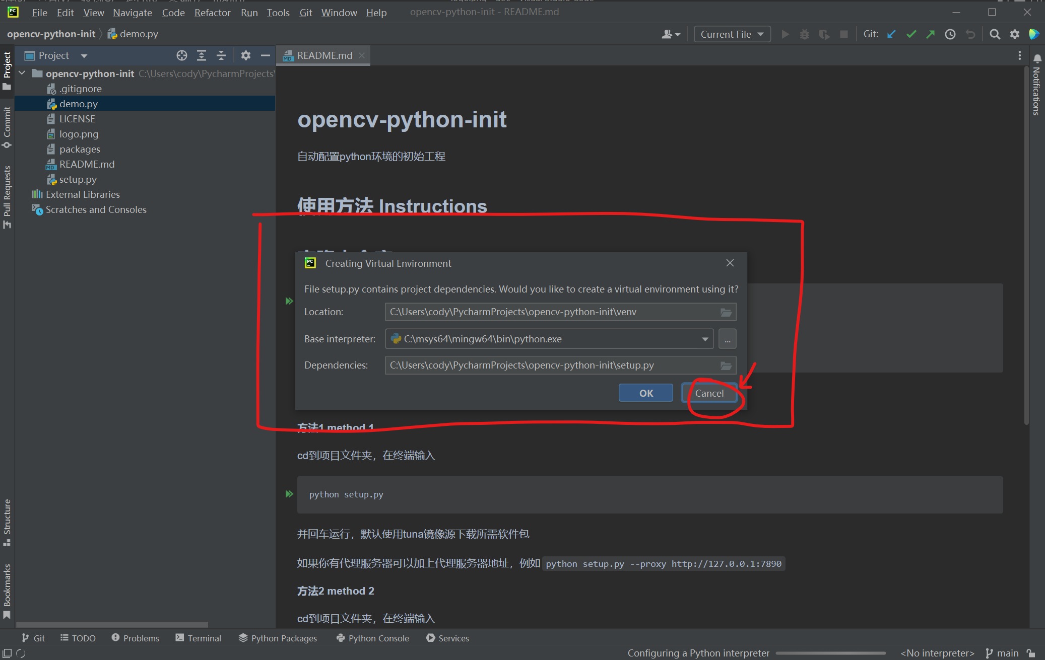 打开仓库文件夹后,第一次会提示配置虚拟环境,请直接点击Cancel取消