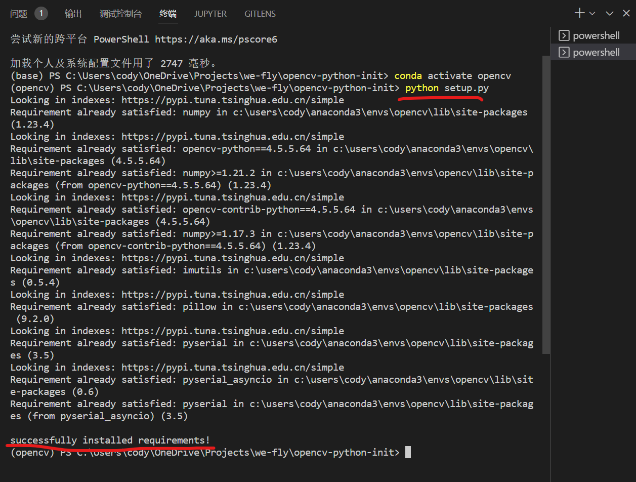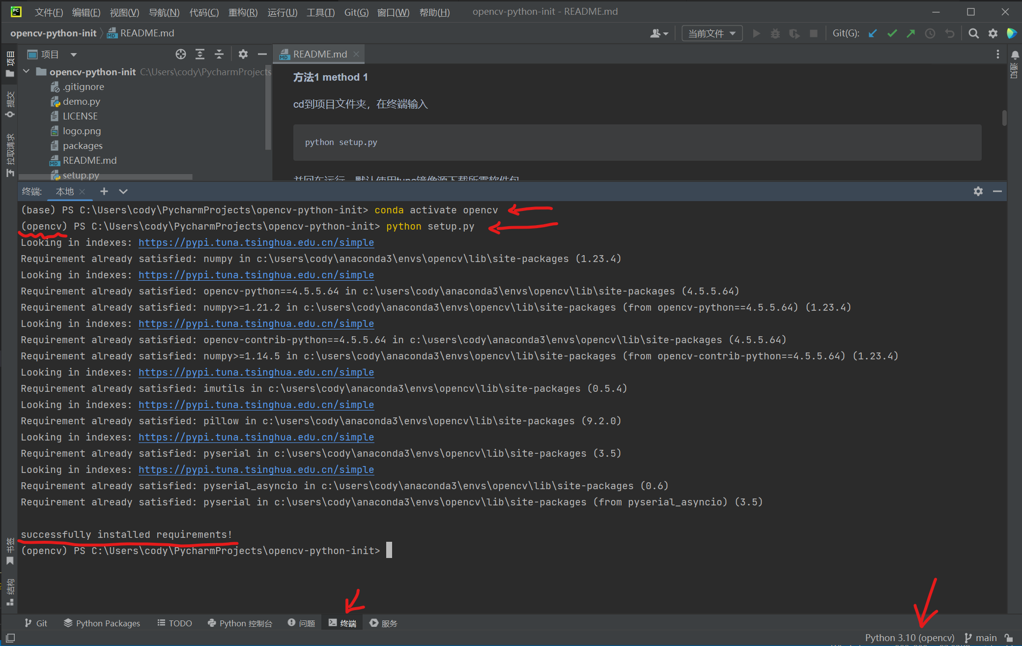 python setup.py就会自动安装opencv-python和其他软件包
