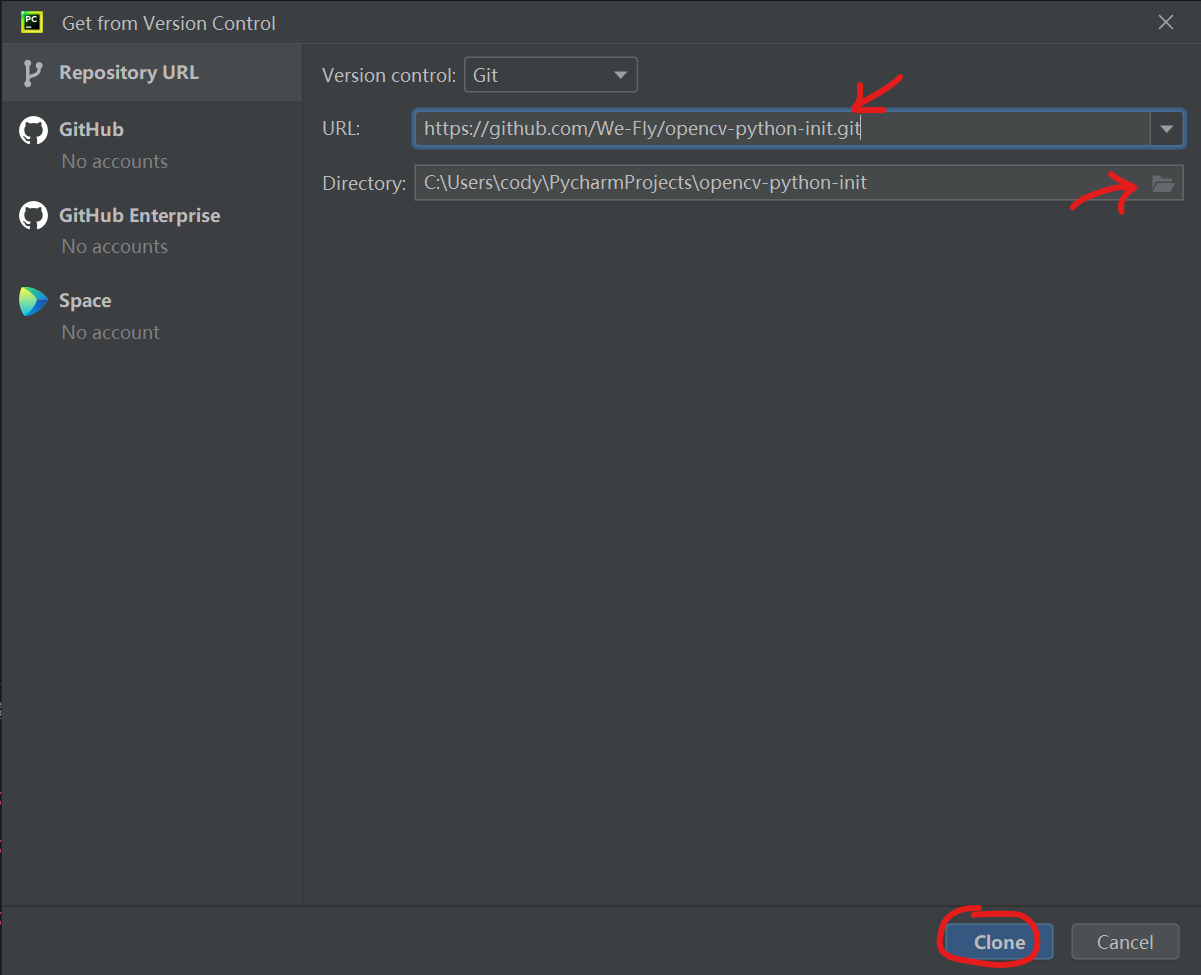 在弹出的窗口内,URL一栏内填入我们的示例仓库地址https://github.com/We-Fly/opencv-python-init.git,然后选择一个位置存放你的仓库,然后点击下方的Clone按钮克隆仓库