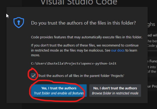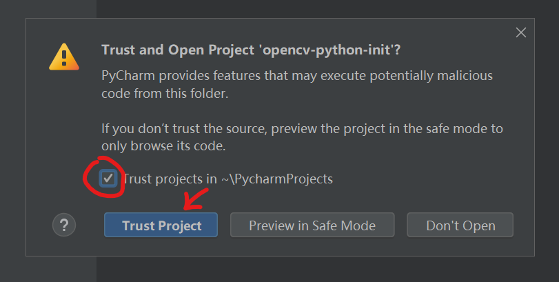 克隆完成以后,会提示你是否信任仓库,如果你嫌麻烦的话,可以勾选信任父文件夹,以后放在这个文件夹下的项目都不会再提示是否信任了。然后点击Trust Project