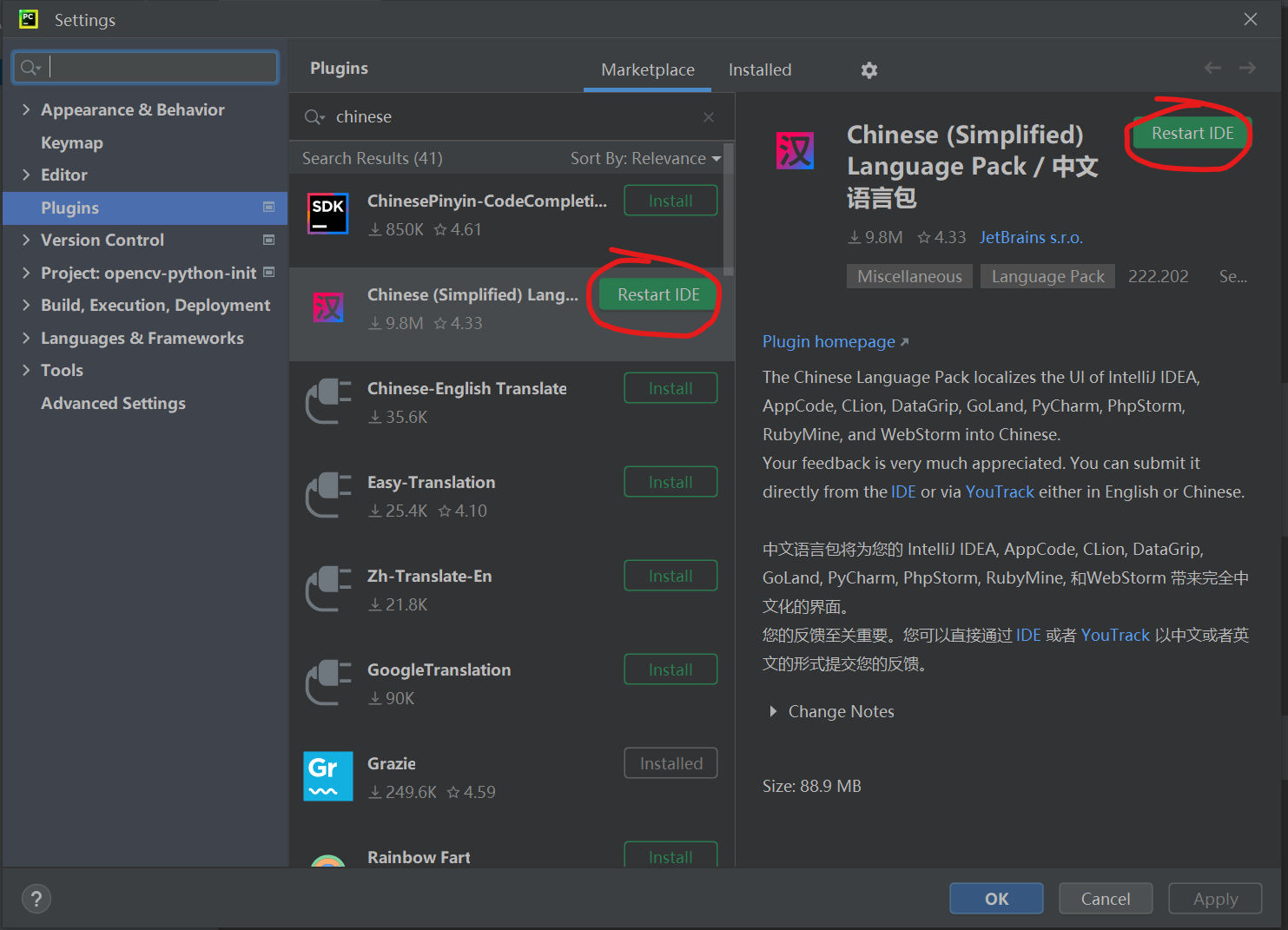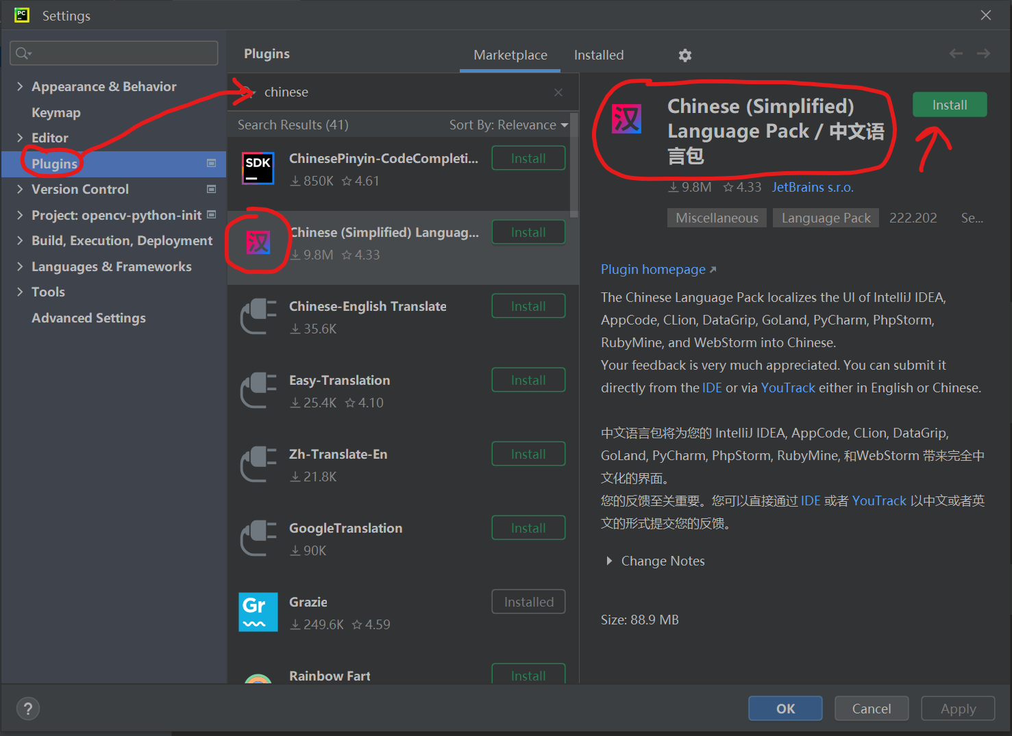 在弹出的界面左侧选择Plugins标签页。搜索框内输入chinese,第二个插件就是我们需要的中文语言包,点击install安装