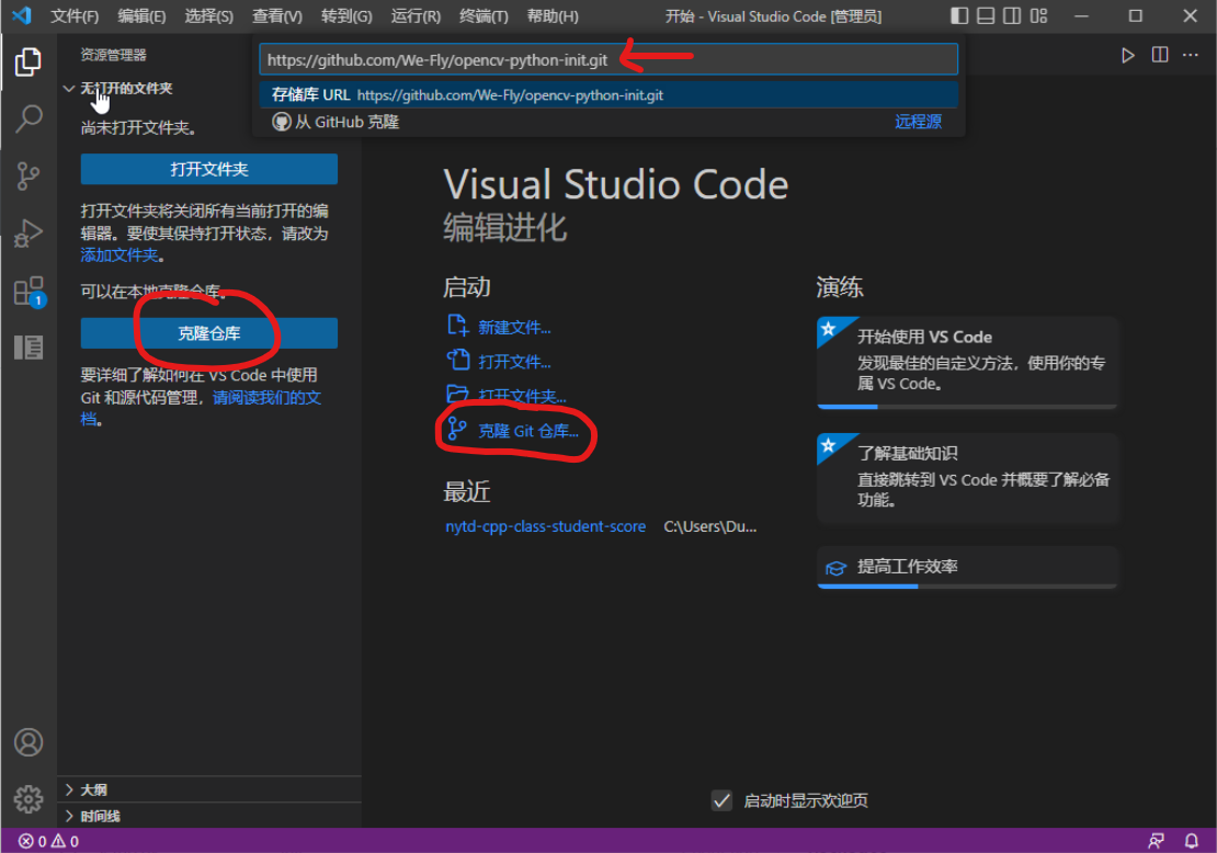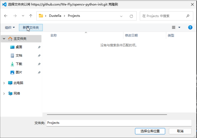 然后点击克隆仓库,将示例仓库地址粘贴进去https://github.com/We-Fly/opencv-python-init.git然后按回车