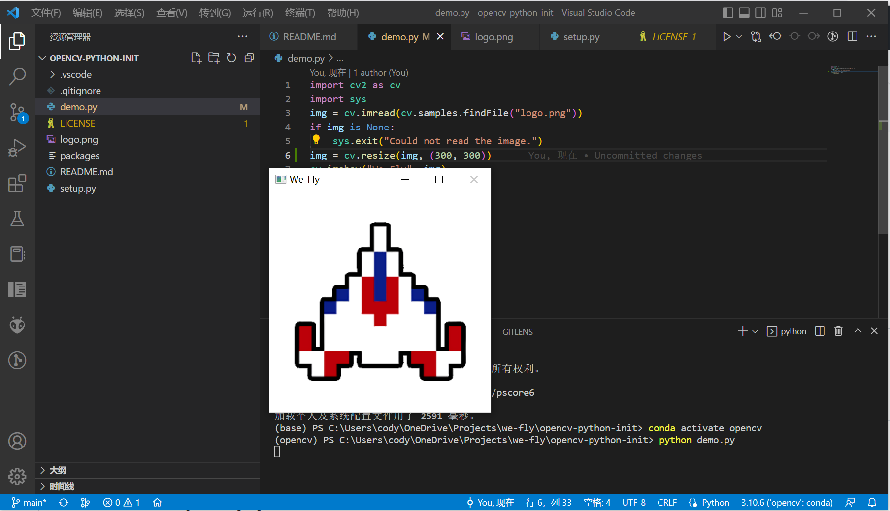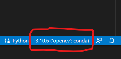 此时界面右下角会变成你刚刚选择的conda虚拟环境,比如我就是Python 3.10(opencv)