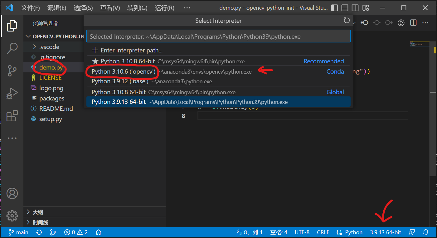 然后点击图片右下角的这个数字,一般是这个默认的python解释器,我们点一下,会弹出上面的这个窗口,你选择你创建的conda虚拟环境,比如这边的Python 3.10.6 (opencv)