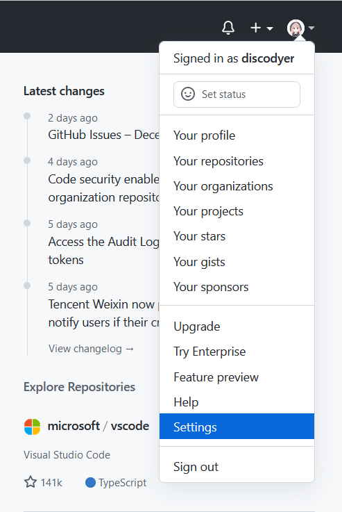 点击右上角的头像,然后在下拉菜单中点击Settings