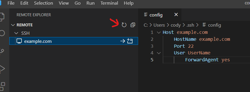 ForwardAgent yes # 这个选项是开启ssh-forward功能,不需要的话可以不添加添加好以后,注意保存配置文件,然后点击左侧的刷新按钮